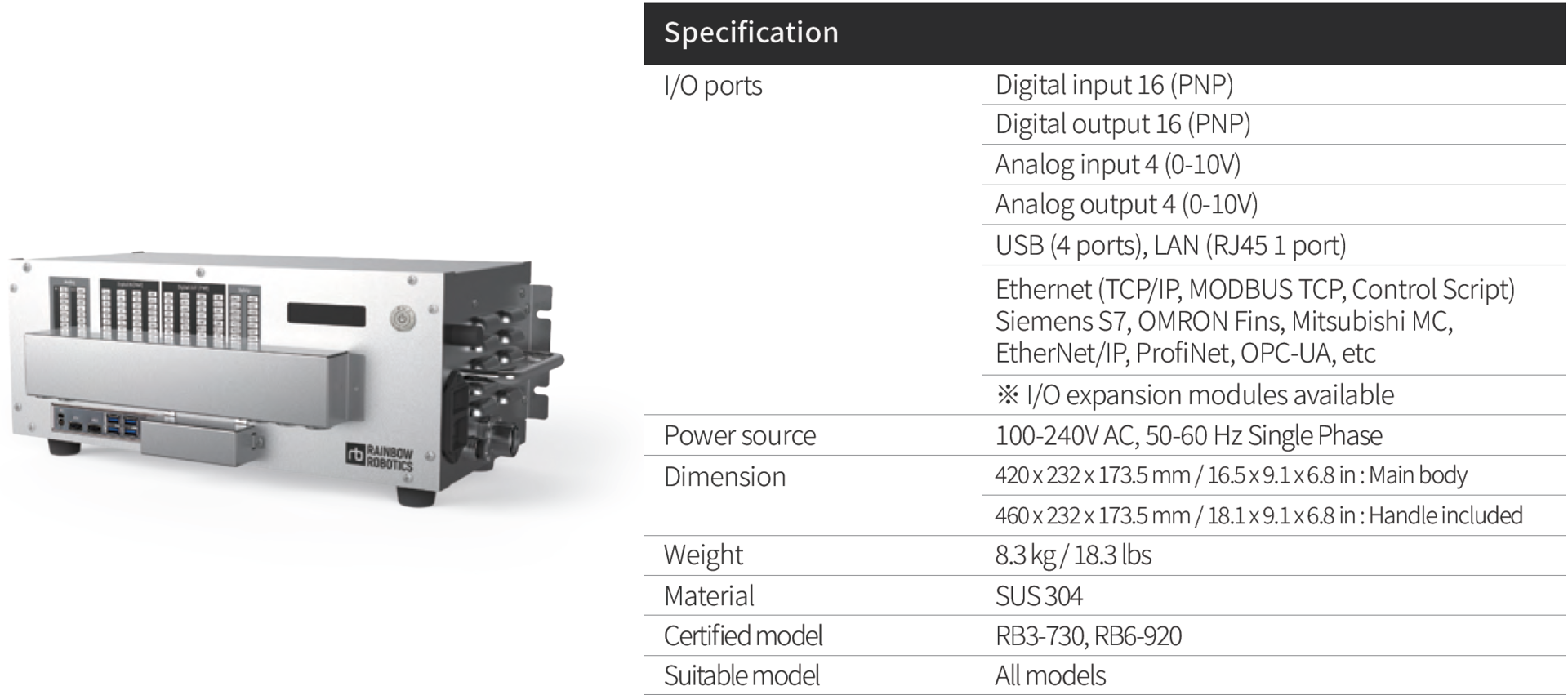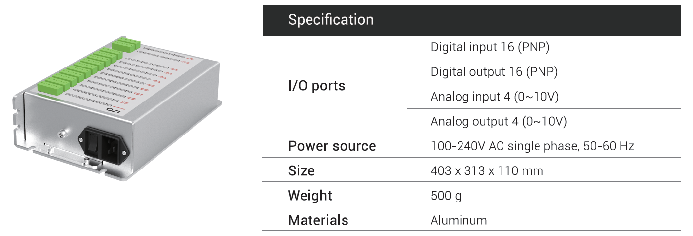 RB series have a total of 40 I/O ports (default configuration). If more I/O ports are required, users can add ports without using additionnal equipment, such as PLC, using the I/O expansion module.