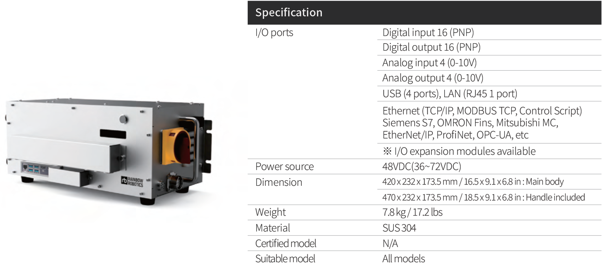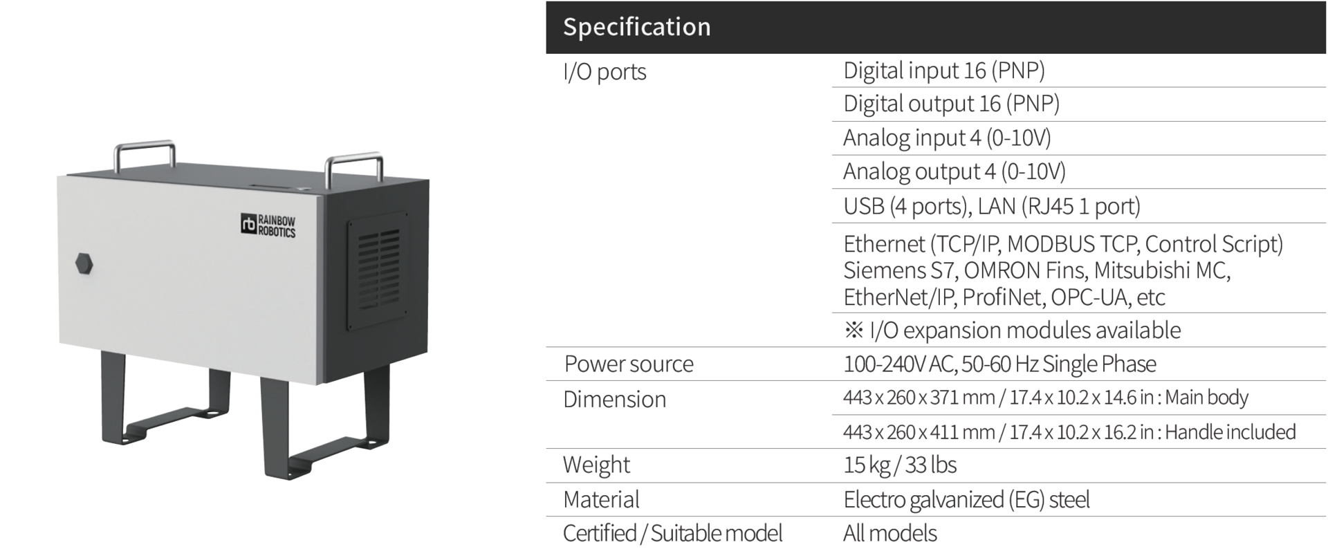 Robot control box is a device that controls the movement of the robot arm according to the program written by the user. Equipped with digital and analog input/output ports. Various equipments and devices can be connected and used.
