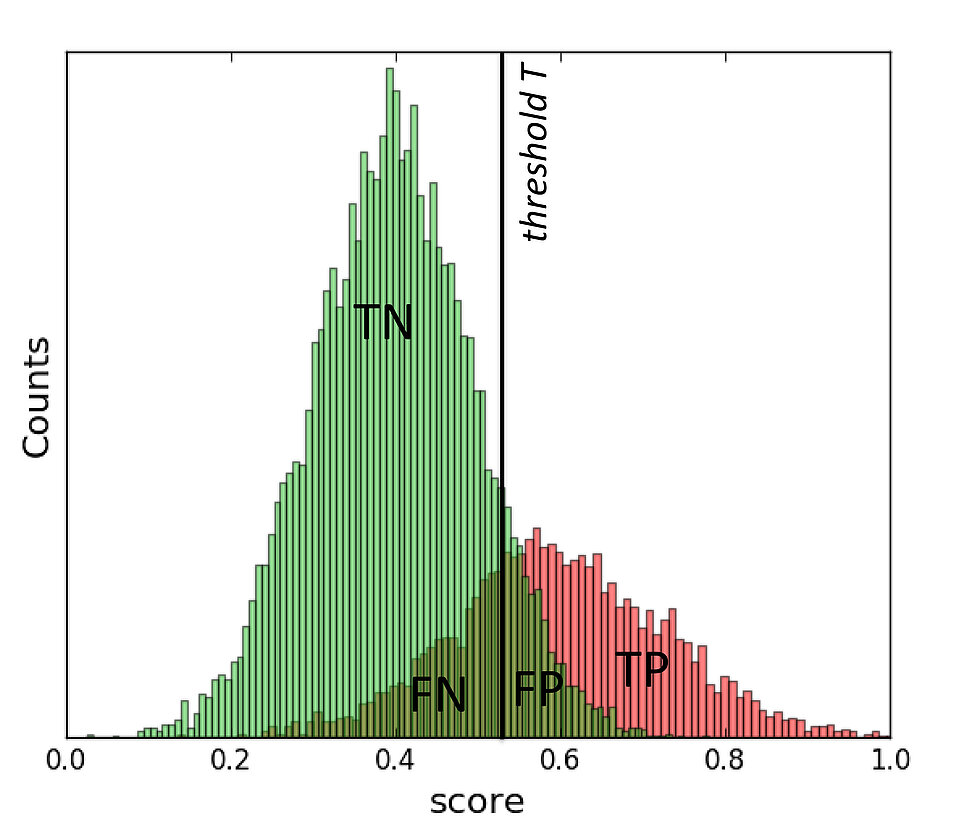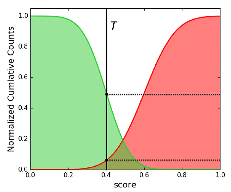 Eine einfachere Darstellung ergibt sich aus der Auftragung der kumulierten und auf Eins normierten Streubereiche. Diese können sich je nach Aufgabe und Bewertungskriterien entweder teilweise überlappen oder zwei deutlich getrennte Gruppen bilden. Wenn das Training optimal gelaufen ist, gibt es zwischen den kumulierten Häufigkeitsbereichen keine Überlappung. Dies belegt dann eine gute Trennschärfe des Verfahrens. Ist dies nicht der Fall, so landet man im Entscheidungsbereich zwischen „falsch-positiven“ und „falsch-negativen“ Einstufungen. In solchen Fällen spielt die optimale Festlegung des sogenannten Treshhold-Wertes eine wichtige Rolle. Platziert man diesen mehr zur sicheren Seite hin, so minimiert man beispielsweise das Ausfallrisiko von sicherheitsrelevanten Komponenten beim Kunden. Mit der umgekehrten Strategie kann man dagegen ggf. das interne Ausschussgeschehen absenken.