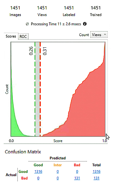 „Eine wichtige Eigenschaft der ViDi-Analyse ist die numerische Bewertung der Klassifikation des jeweiligen Ergebnisses“, setzt L. Vassalli hinzu. Das System klassifiziert begutachtete Bilder zwar grundsätzlich nach den Kriterien „IO“ bzw. „NIO“, gibt aber hierzu stets einen prozentualen Vertrauenswert aus. Dieser gibt an, zu welchem Prozentsatz die Software Bild sich in ihrem Urteil sicher ist. Die Skala geht dabei von 0 (= 100% IO) bis zu 1 (= 0% IO bzw. 100 % NIO). Die Häufigkeitsverteilung dieser Einstufungen wird statistisch in Form von Diagrammen mit z.B. grüner Farbe für IO- und roter Farbe für NIO-Ergebnisse ausgegeben. Sie haben die Form von zwei Balkendiagrammen in grüner bzw. roter Farbe, die sich teilweise überlappen können.
