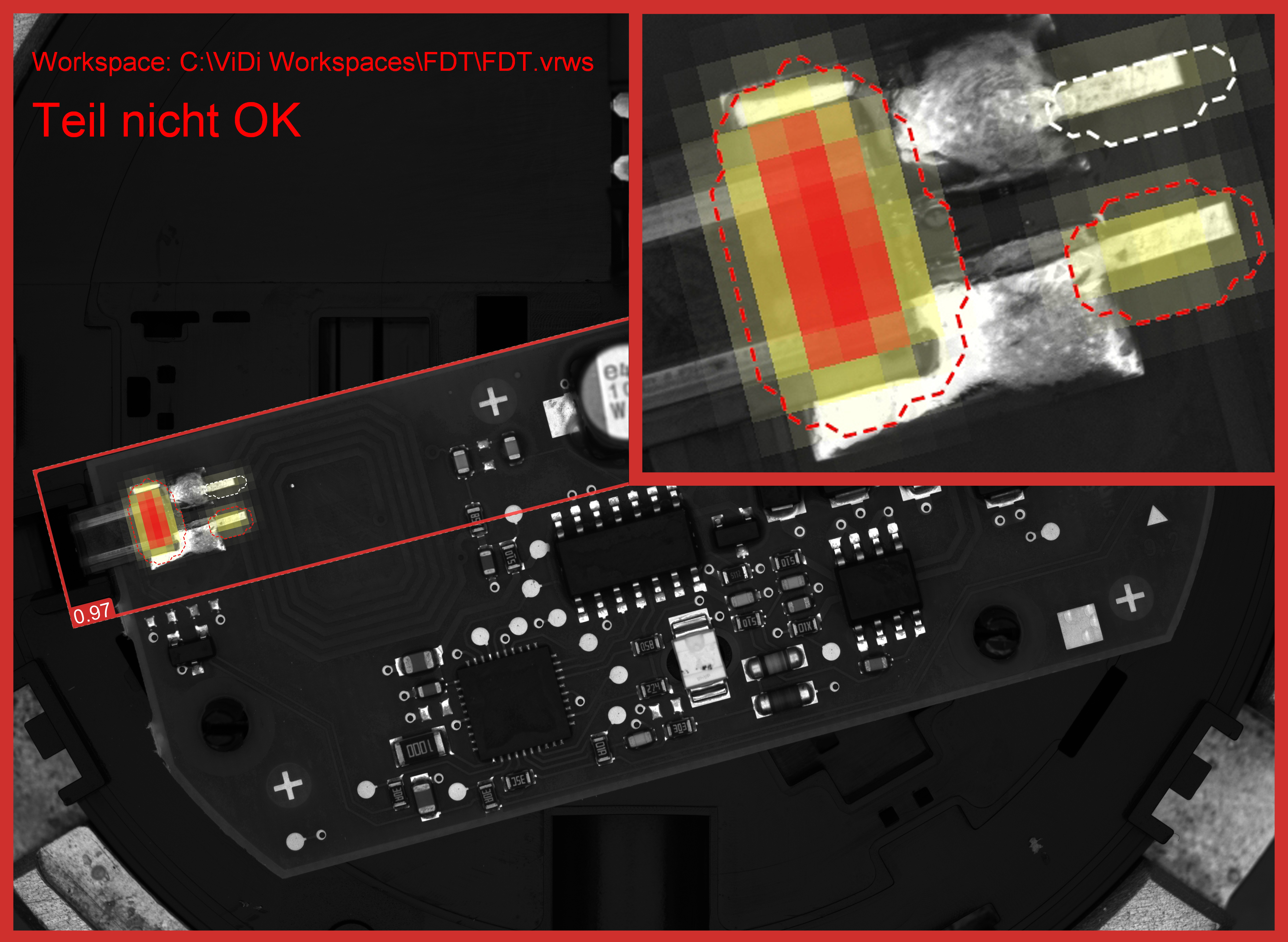 „Besonders interessant wird für die Kunden die Verzahnung der beschriebenen ViDi-Möglichkeiten mit der von uns entwickelten Bildverarbeitungssoftware VISIONexpert®“, bilanziert L. Vassalli. Das Compar-Programm übernimmt als Hauptkomponente zunächst das externe Hardware-Handling, d.h. die Anbindung der zahlreichen möglichen Kameramodelle sowie sonstiger Peripherie. Weitere Aufgabe ist das Bilddaten-Management sowie die Weitergabe von zu analysierenden Bilddaten an ViDi. Die zurückgelieferten Ergebnisse werden intern verwendet, visualisiert und schliesslich in die Entscheidungsfindung eingebunden. Trotz aller Automatik behält der Mensch durch Vorgabe von Prüfkriterien und Entscheidungsvorgaben wie z.B. dem Treshhold-Level stets die Entscheidungsgewalt.