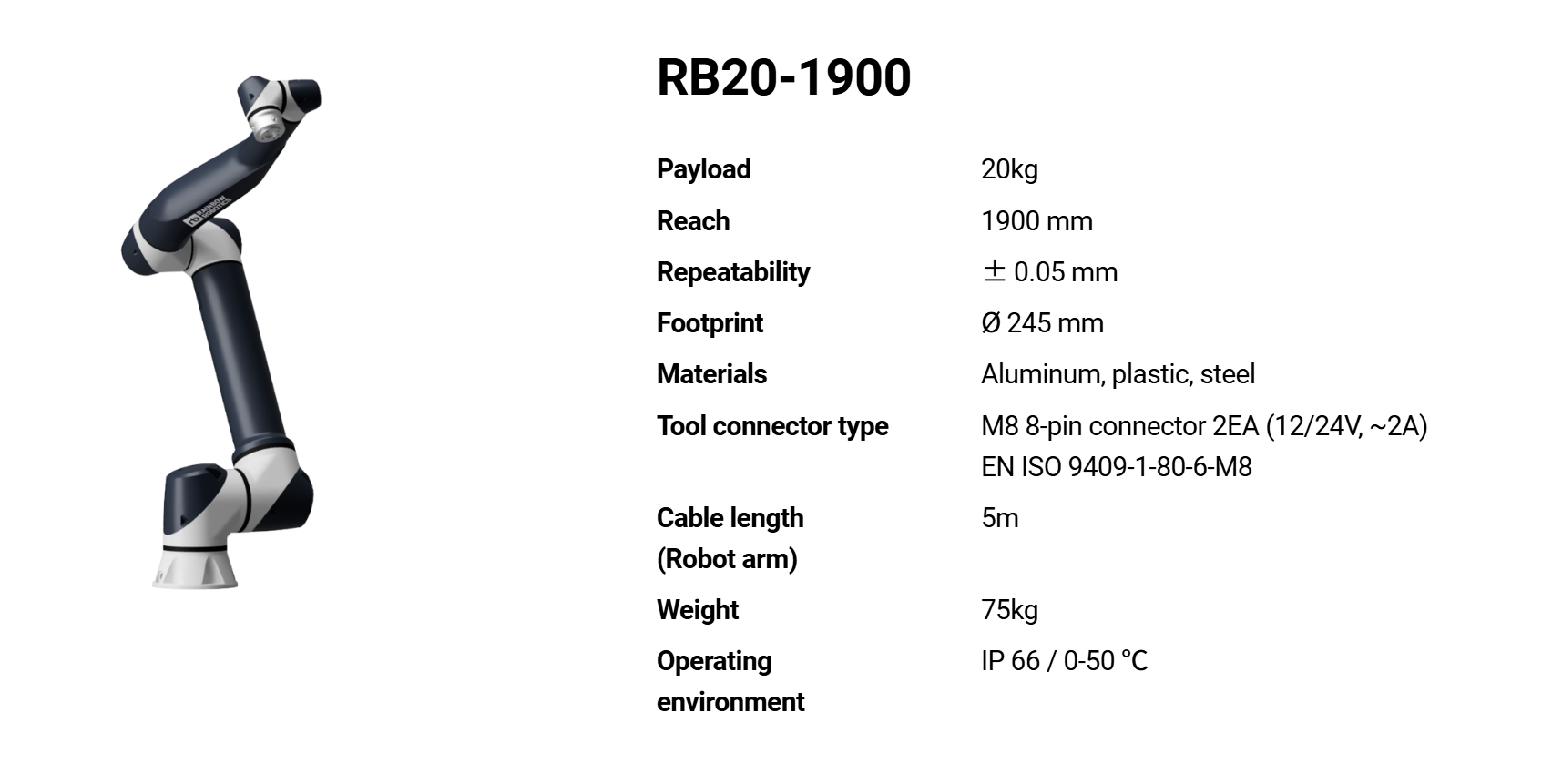 Meet the RB20-1900 — the most potent cobot in the RB series! With a 20 kg payload and a 1,900 mm reach, it’s built for heavy lifting, extended reach, and maximum efficiency.