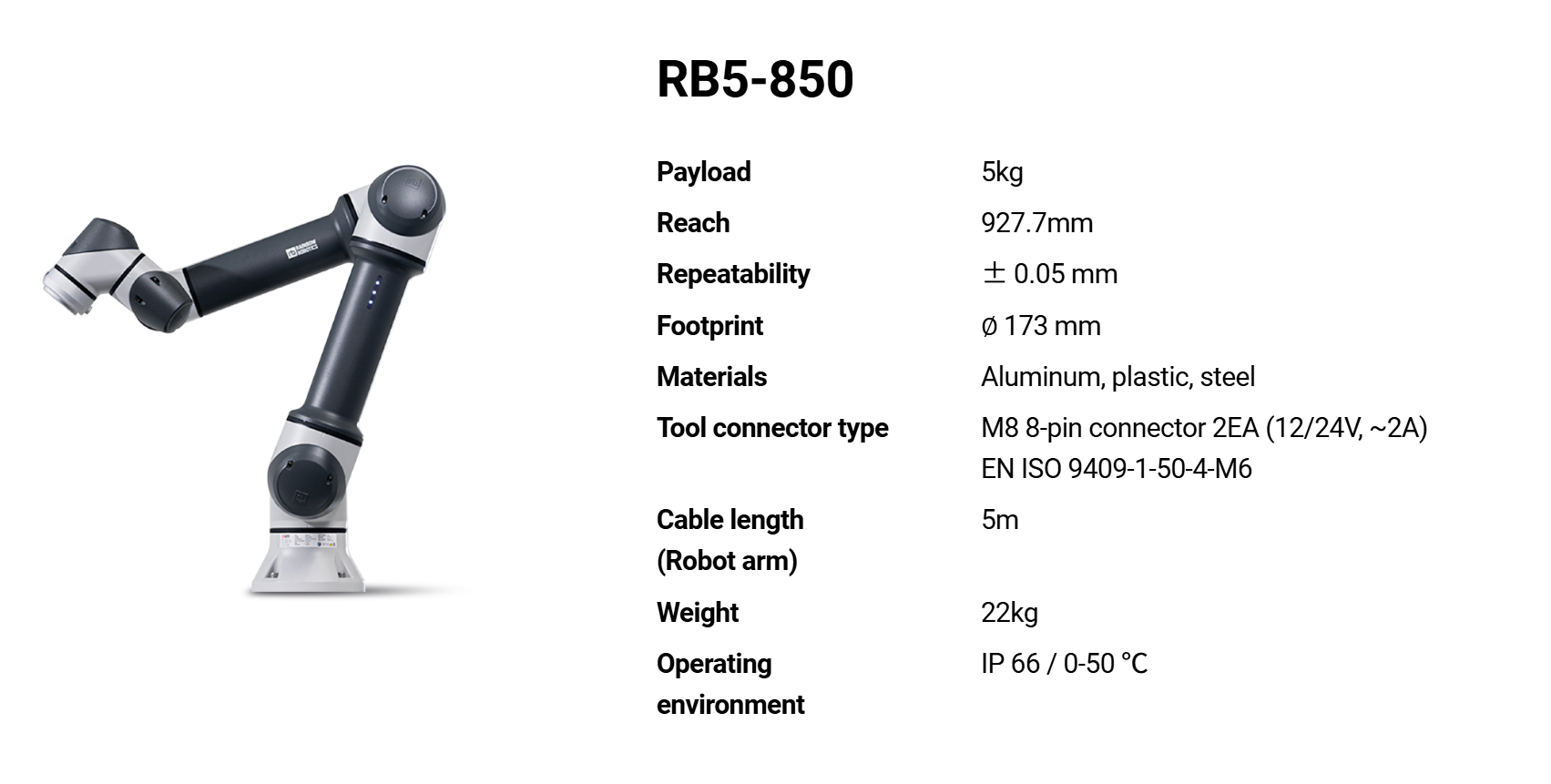 RB5-850 collaborative robot is the most standard model of RB-series, with a max load capacity of 5kg and a max work radius of 850mm.