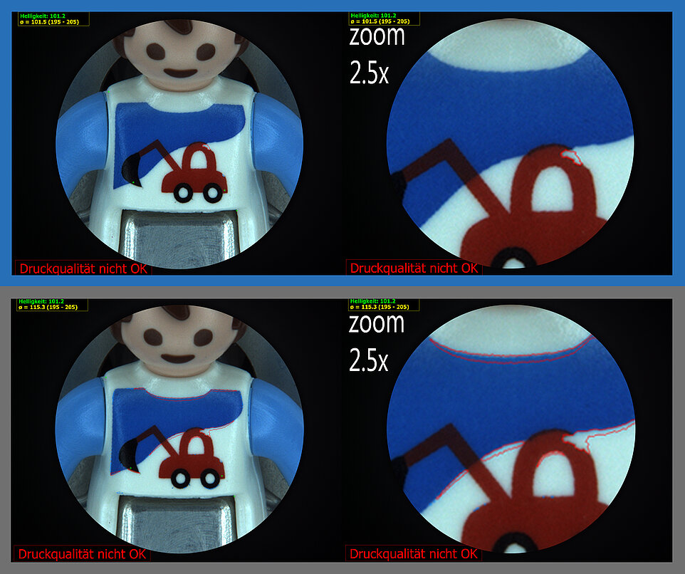 Andere Sektoren wie die Hersteller von Spielzeug oder Verpackungen seien diesbezüglich oft viel toleranter. Hier seien andererseits oft andere Kriterien wie Ästhetik bzw. Produktanmutung zu berücksichtigen. Neben der Frage der reinen Konturschärfe gehe es dabei z.B. dann um Farbabweichungen, Gleichmäßigkeit des Farbauftrags oder Verzerrungen des Druckbildes. Letztere hängen teils vom Druckverfahren ab. So komme es beispielweise beim Tampondruck zu unterschiedlichen Breitungen des elastischen Druckstempels in Abhängigkeit von der Anpresskraft. Auch Geometrievariationen bei zwei- oder dreidimensional gekrümmten Objekten oder temperaturbedingte Maßänderungen im Augenblick des Drucks könnten zu Verzerrungen führen. Wegen dieser Vielfalt musste bisher bei der Entwicklung automatischer Kontrollsysteme fast immer ein individuell auf die Bedürfnisse des Kunden hin entworfener „Maßanzug“ aus Hardware und Software realisiert werden.