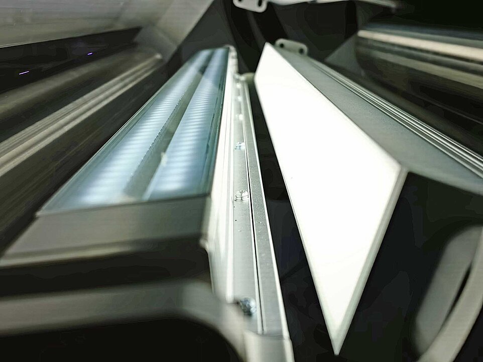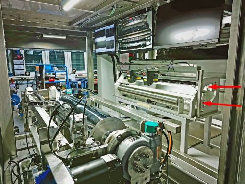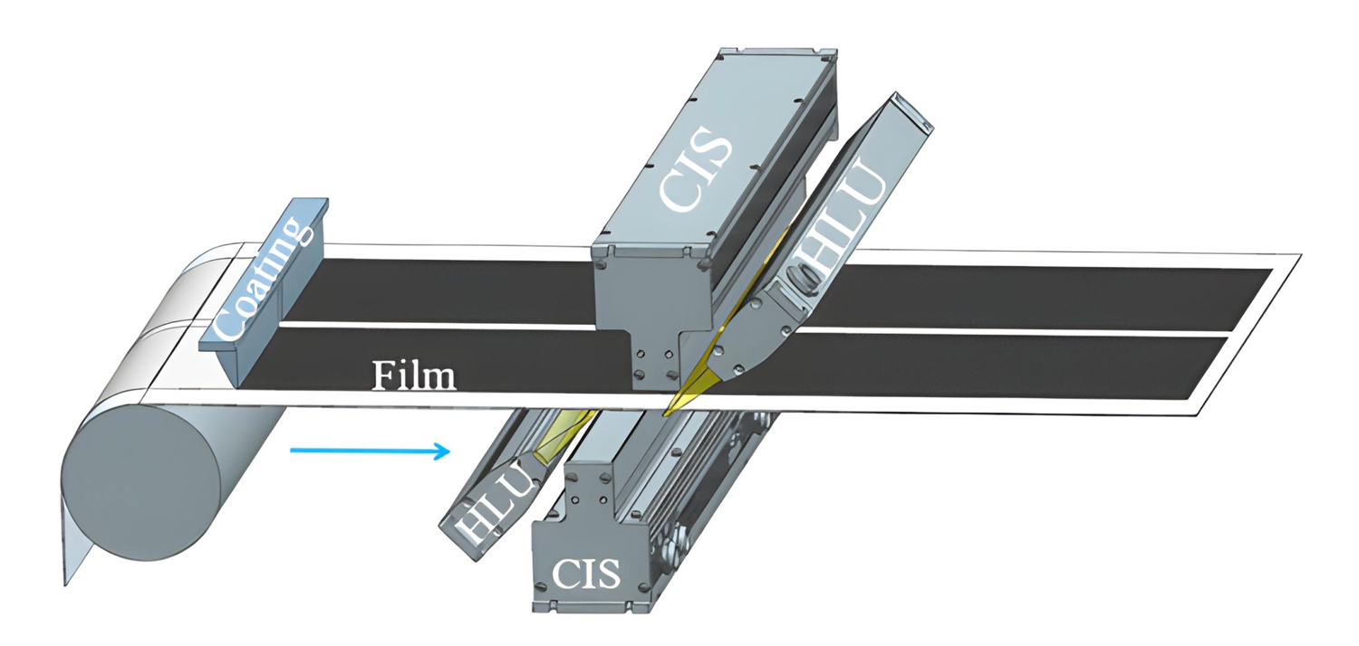 „Einer der Knackpunkte bei der Herstellung solcher Beschichtungsanlagen ist deshalb die sichere Einhaltung enger Positionstoleranzen zwischen den Schichten auf der Ober- und Unterseite der Folien“, erläutert Clemens Disch. Referenz ist jeweils die Bandkante in Laufrichtung rechts. Mit Bezug dazu muss die Beschichtung einen definierten Abstand mit einer Positionstoleranz von ± 0,2 mm einhalten. Die bisher eingesetzten CCD-Kamerasysteme waren nicht zuverlässig, die aktuelle Breite von 760 mm erforderte bereits den Einsatz von mehreren Kameras nebeneinander. Stattdessen fiel die Wahl auf einen sogenannten Contact Image Sensor (CIS). Hierbei handelt es sich um „Zeilenkameras“, wie sie auch in Kopiersystemen zum Einsatz kommen. Für die Beschichtung werden jedoch wesentlich höhere Genauigkeiten und Geschwindigkeit benötigt. Der jetzt eing esetzte CIS-Sensor ist 800 mm breit und besteht aus knapp 19.000 linienförmig angeordneten monochromen Fotozellen mit Festfokus-Optik. Die einzelnen Fotozellen haben einen Abstand von 0,042 mm. Ebenfalls integriert sind zwei Reihen von Leuchtdioden jeweils vor bzw. hinter der Fotozellen-Reihe. Ein wesentlicher Unterschied zu den einfachen CIS-Sensoren in Kopierern ist die Scangeschwindigkeit, denn das mit bis zu 10 m/min durchlaufende Band muss mit einer Abtastrate von fast vier MHz erfasst werden.