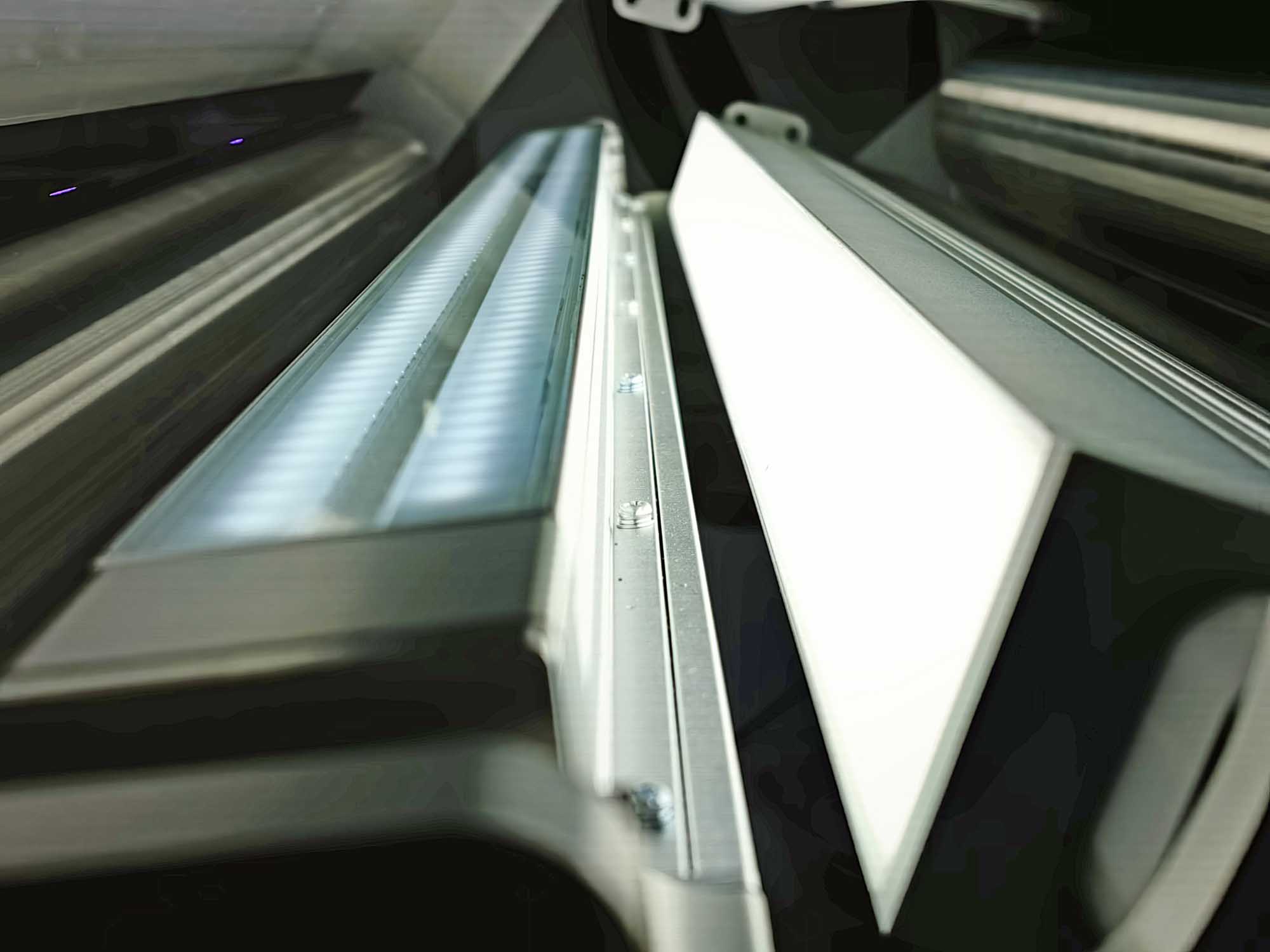 Ein weiterer wichtiger Gesichtspunkt bei der Auswahl des Sensors ist die Fähigkeit, schwierigste Kontrastverhältnisse von metallisch glänzend und spiegelnd bis zu mattschwarz absorbierend bewältigen zu können. Deshalb war im vorliegenden Fall eine zusätzliche Ausstattung mit einem schräg angeordneten Lichtbalken erforderlich. Pro Anlage kommen zwei derartige Systeme zum Einsatz, je eines für Oberseite bzw. Unterseite des Bandes. Hierbei vermisst der obere Sensor sowohl die Bandkantenlage als auch die Breite der Beschichtung(en), während der untere Sensor lediglich die Bandposition überwacht.