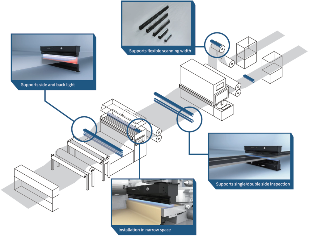WHEC CIS (Contact Image Sensor) are widely used worldwide for various applications on Print Machines, Lithium-ion Battery Coating, Label Inspection, customized integration, or scalable systems