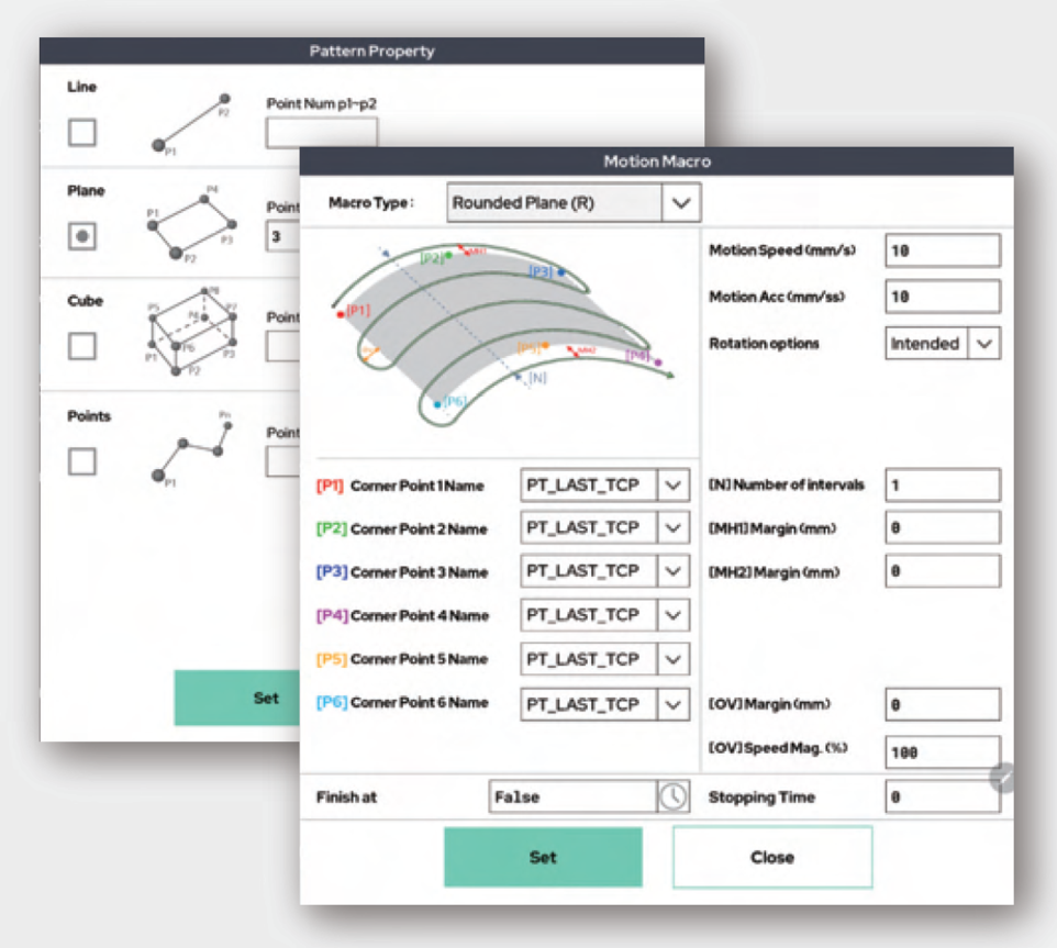 - Advanced Motion Generation: Pattern, Weaving, TCP-Weaving, Conveyor, Force-Control, Motion Macro, RePlay, G-Code, Pin-Point, Pin-Joint