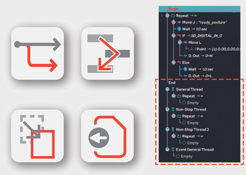 - Program Logic Flow: Wait, if/else, Repeat, Break, Continue, Switch, Halt, Jump, Pre-Program, Post-Program, Thread, Sub-Program, Convert