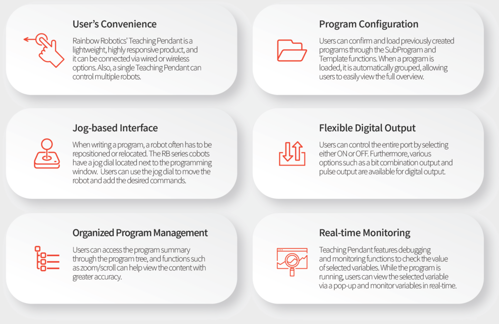 Rainbow Robotics’ cobots are easy to program using the Rainbow Robotics Teaching Pendant. Moreover, the icon-based GUI allows users to configure the interface to suit their required conditions. The user-friendly GUI also makes maintenance easier, improves security, and enables intuitive programming. Teaching Pendant is compatible with Android OS-based smartphones, tablet PCs, and Windows OS-based devices.