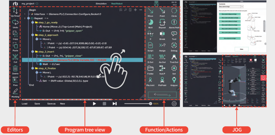 Rainbow Robotics provides an intuitive and progressive proprietary UI. Deploy your automation project with just a few clicks through the touch screen / monitor. Convenient program creation increases your productivity and reduces the time and cost required for program management.