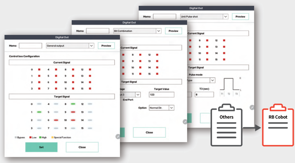 - I/O Control Function: Digital Out, Analog Out, Extention I/O Control, Tool-Flange Out, Gripper