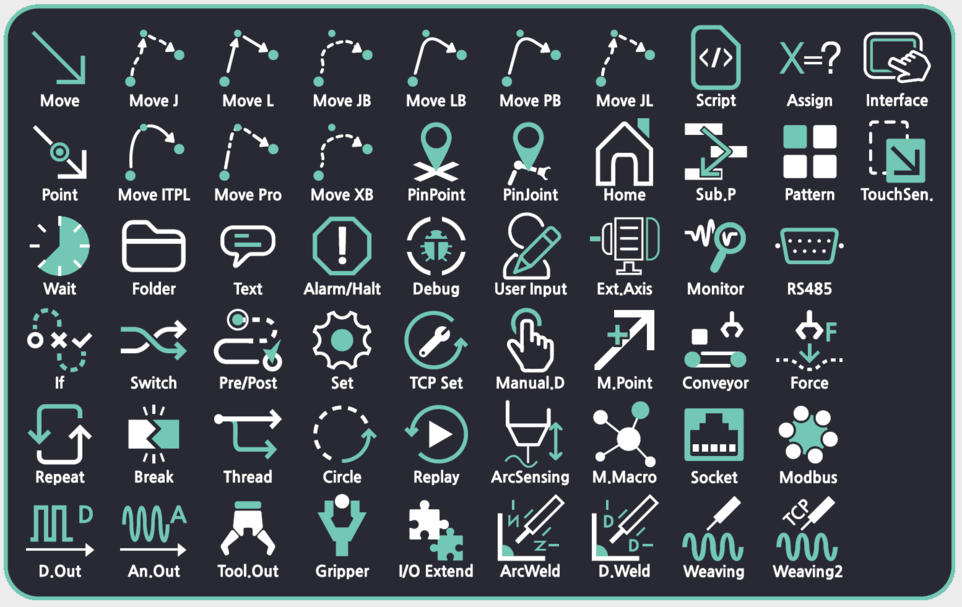 - Robot Arm Movement: Move J, Move L, Move JB, Move LB, Move PB, Move JL, Move ITPL, Move Pro, Move XB, Circle, Home